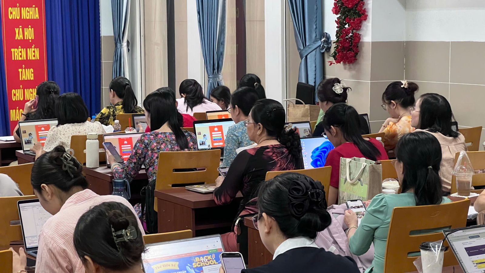 Không khí buổi tập huấn càng trở nên sôi nổi khi các thầy cô cùng nhau thảo luận, đặt câu hỏi và chia sẻ kinh nghiệm trong quá trình ứng dụng DLib K12 vào giảng dạy. Nhiều ý kiến thực tế được nêu ra xoay quanh việc xây dựng kho học liệu chung, tạo bài kiểm tra, hay cách tổ chức tiết đọc thư viện trực tuyến cho học sinh. Mọi thắc mắc đều được giải đáp cụ thể, giúp buổi tập huấn trở nên hiệu quả hơn.