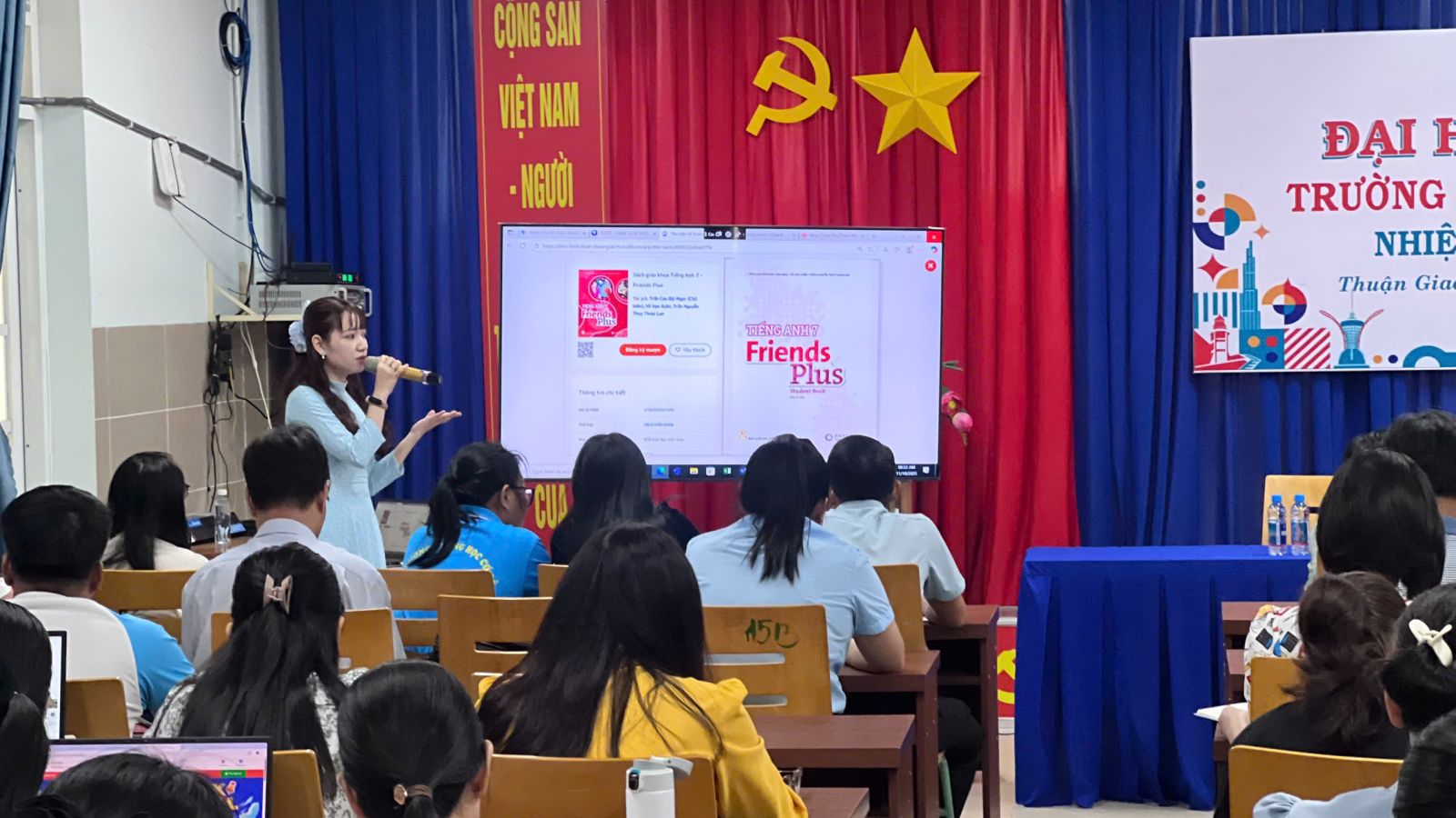 Tại buổi tập huấn, chị Ánh Tuyết – Trưởng phòng Chăm sóc khách hàng Công ty VDOC, trực tiếp hướng dẫn và chia sẻ những tính năng nổi bật của hệ thống DLib K12. Thông qua các thao tác thực tế trên màn hình, giáo viên được trải nghiệm cách tìm kiếm tài liệu thông minh, lưu trữ học liệu cá nhân, chia sẻ tài nguyên và tạo lớp học trực tuyến ngay trong hệ thống. Các bước hướng dẫn được minh hoạ rõ ràng, giúp thầy cô dễ dàng tiếp cận và sử dụng thành thạo.