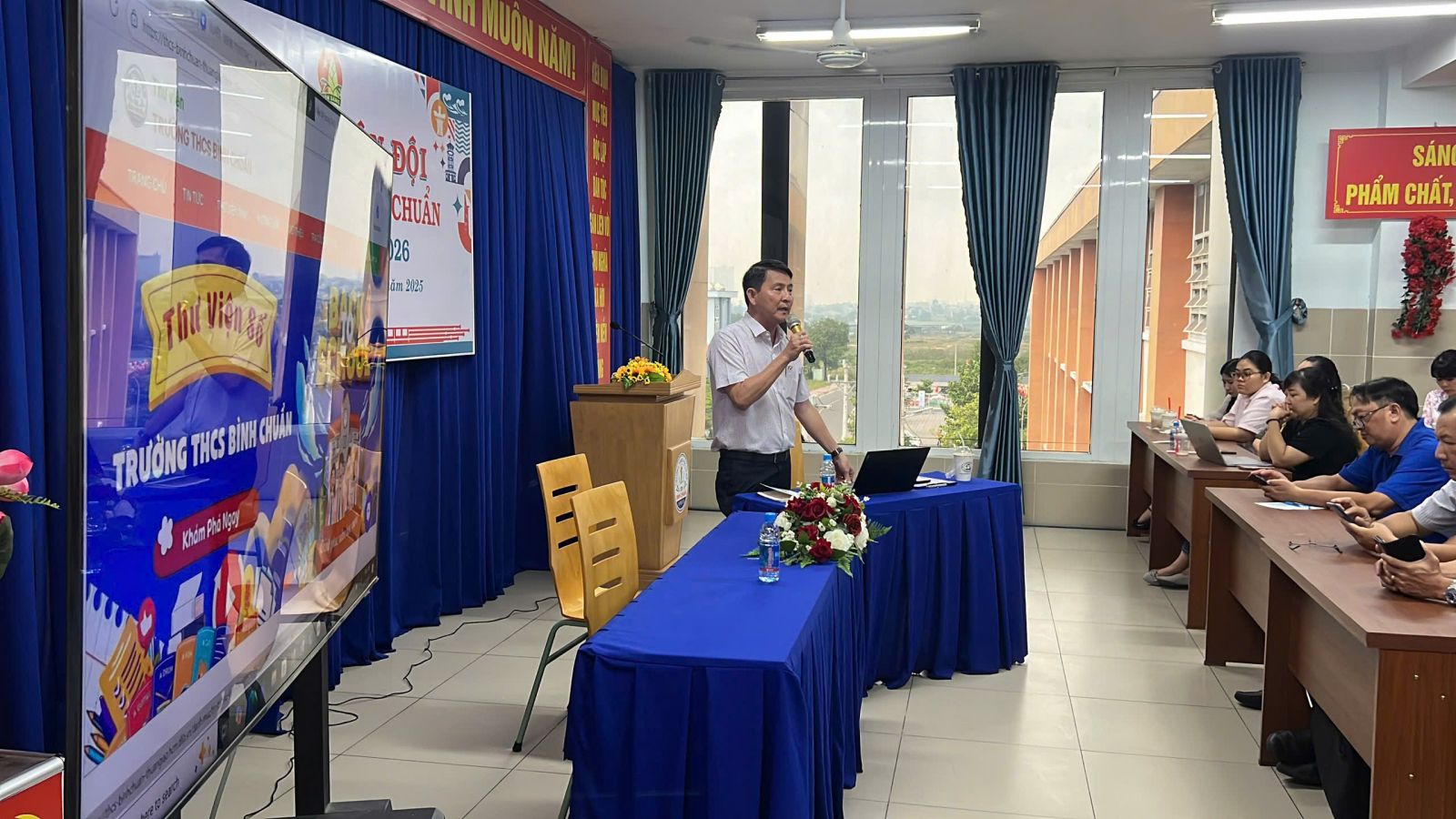Mở đầu chương trình, thầy Hiệu trưởng trường THCS Bình Chuẩn- đại diện Ban Giám hiệu nhà trường, đã có đôi lời phát biểu và chia sẻ về vai trò quan trọng của Thư viện số DLibK12 đối với khối THPT. Theo thầy, DLibK12 không chỉ giúp học sinh tiếp cận tri thức một cách linh hoạt, mọi lúc mọi nơi, mà còn hỗ trợ giáo viên đổi mới phương pháp dạy học, cá nhân hóa việc học của từng học sinh trong bối cảnh chuyển đổi số đang diễn ra mạnh mẽ hiện nay.